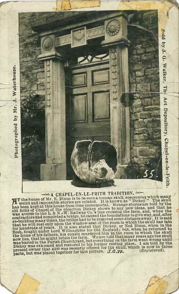 Regular readers will know that I’ve been on the trail of Dickie’s Skull for a while. A staple of books about ghosts and legends in the Peak District, the human skull sat on a windowsill at Tunstead Farm in Derbyshire for several centuries. Accounts differ of how and when Dickie (or Dickey) was found, and who exactly he was but most people agreed that if the cursed cranium was removed from its favoured spot or compromised in any way, terrible things would happen. The legend peaked in the 1800s when Dicky famously scuppered the building of a nearby railway. The story made it into the national press and there was a poem written about Dickie’s Skull, and even a play.